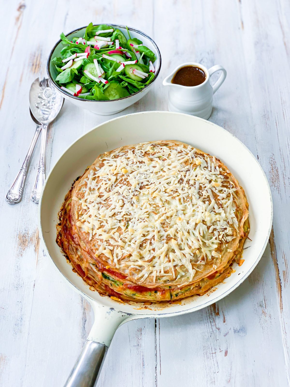 Nothing beats a crepe stack, layered up with cheese and tomato sauce baked in the oven and served from the oven to the table. You can fill these crepes with all kinds of veggies in the layers, and topped with fried eggs to create an incredibly delicious, fabulously nutritious breakfast, brunch or evening dish.
