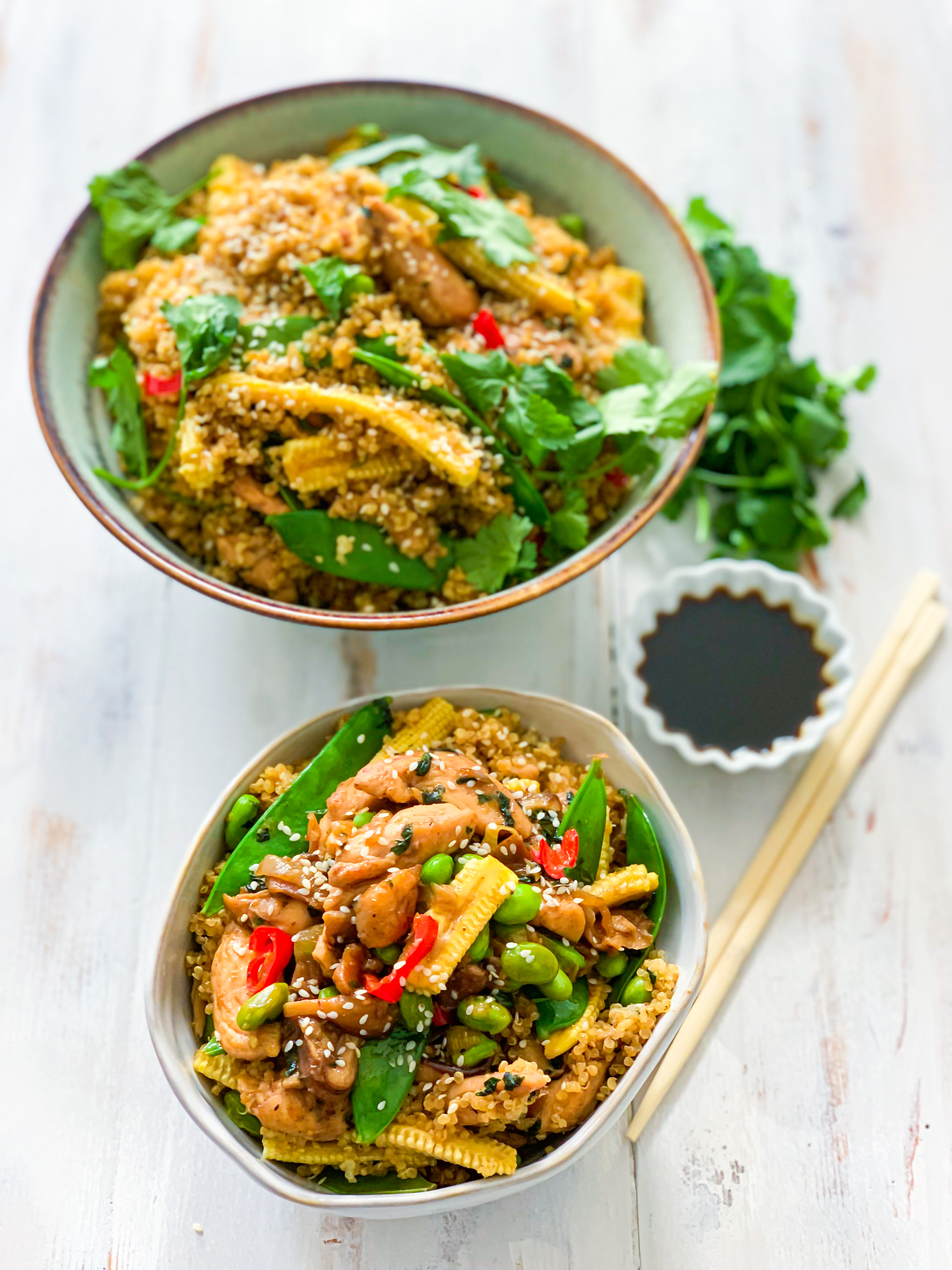 A great dish for everyone to tuck into and share. A simple mid-week meal that satisfies all the family. This Chicken Quinoa Stir Fry is super simple to put together and is extremely high in protein, plus it’s perfect for using any leftovers served cold as a salad!