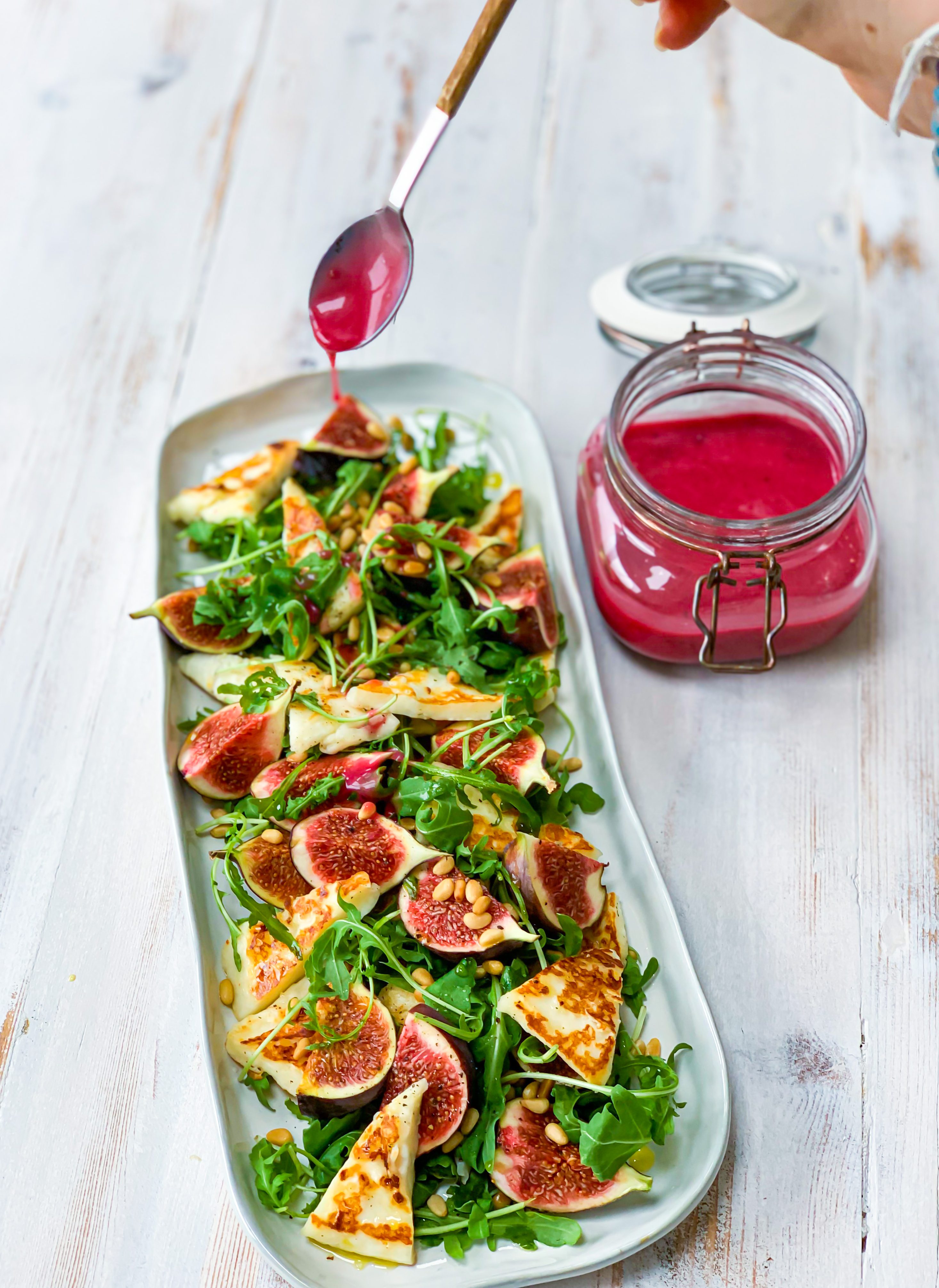 The wonderous halloumi! I love how a firm cheese can be pan-fried with without melting. Nothing beats paring the saltiness of the halloumi with jammy figs and a touch of honey. The blueberry dressing adds another dimension to the salad with its vibrant colour and only takes a few minutes in the blender to come together.
