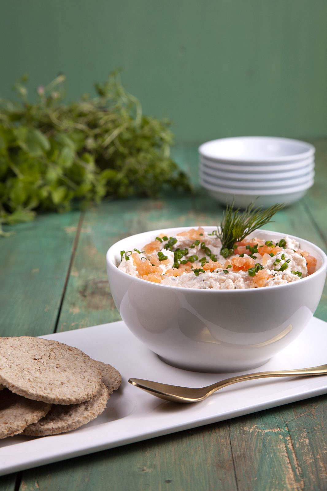 - In a food processor blend the cottage cheese, smoked salmon, dill and juice of the lemon. Season with herbamare and black pepper to taste. Place in a serving bowl and garnish with the chopped smoked salmon, cracked black pepper, chopped chives and sprig on dill. Cover and transfer to the fridge to chill. Remove from fridge 5 minutes before serving.