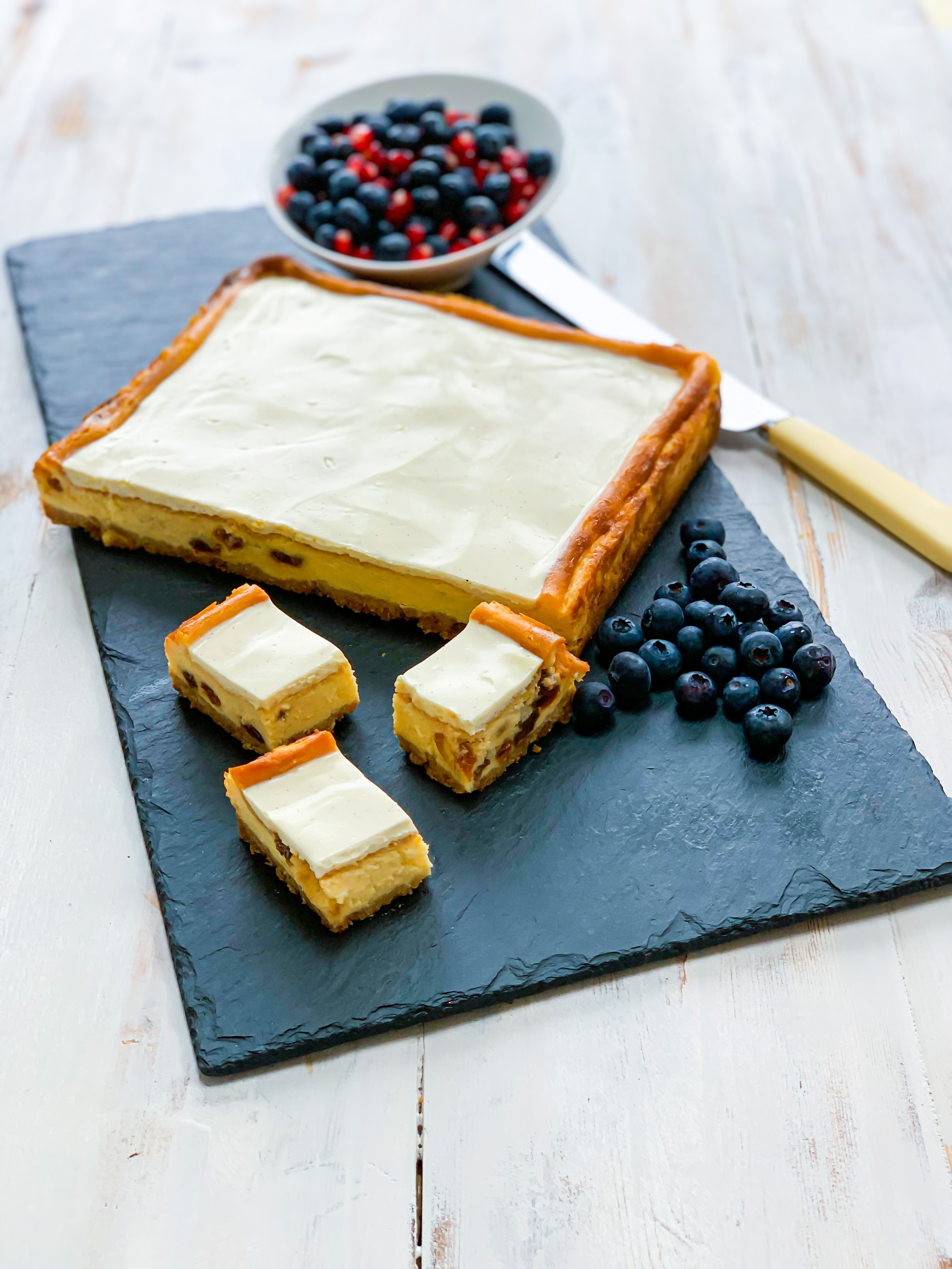 - Gently pour the cream cheese mixture over the biscuit base, if you’re using the sultanas, scatter them over the top and then using the back of a large metal spoon, swirl them into the mixture so that they aren’t visible.