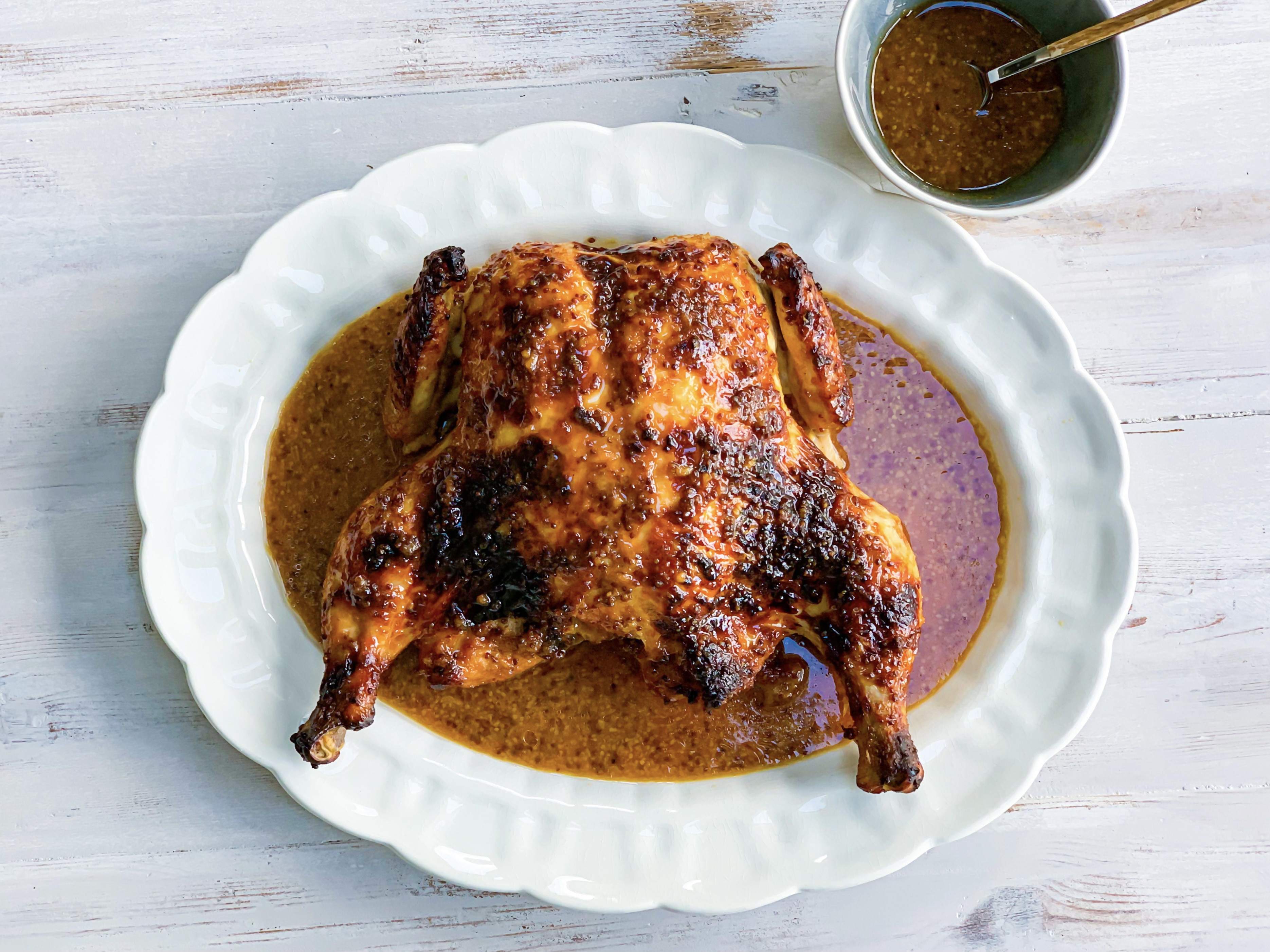 - Season the chicken on both sides and in the cavity with sea salt, white pepper and garlic granules. Place the chicken in the roasting dish with the breast facing upwards, pour the marinade over the chicken (you can marinate the chicken the day before) cover with foil and place in the pre-heated oven for 30 minutes.